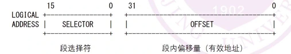 - 程序给出 48 位逻辑地址(16位段选择符 + 32 位有效地址)